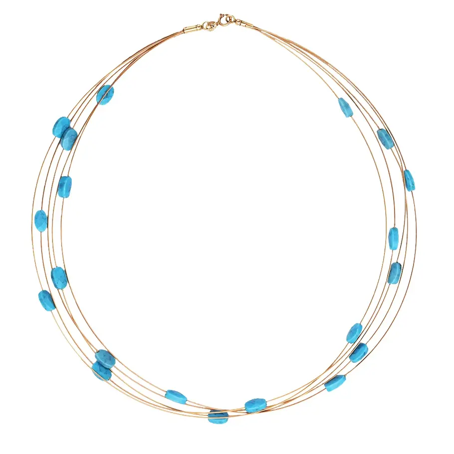 A lovely 5-ply gold and turquoise necklace measuring 5.5 x 8.5mm. The 20 oval turquoises are strung on 5 rows of 14k gold multistrand wire. The necklace has a 14k gold safety clasp. A valuable, unique and special piece of jewelry for women who wish to impress in every appearance.