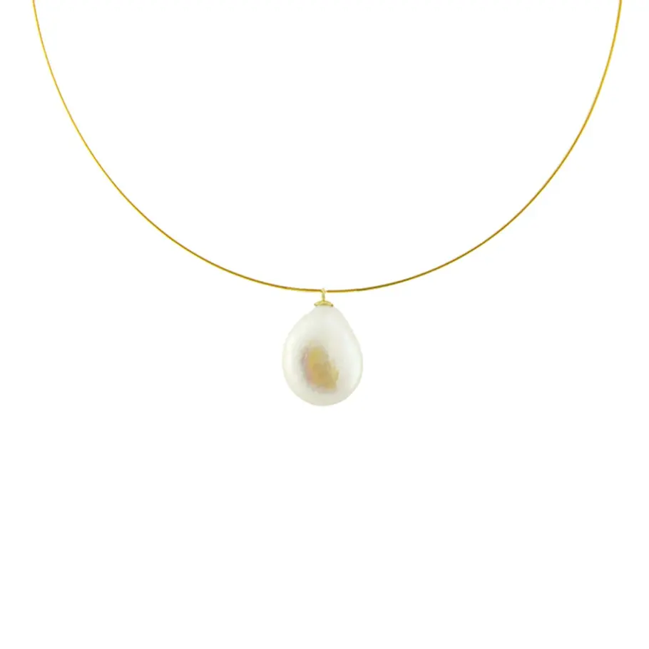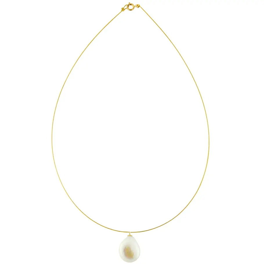 A unique pendant necklace with 1 stunning natural white Fresh Water Pearl Drop shape of excellent quality 13x18mm in diameter. It has a 14-carat gold base. Comes with a special gold-colored steel wire with a K14 gold clasp. It appeals to women of all ages, combining simplicity with luxury.